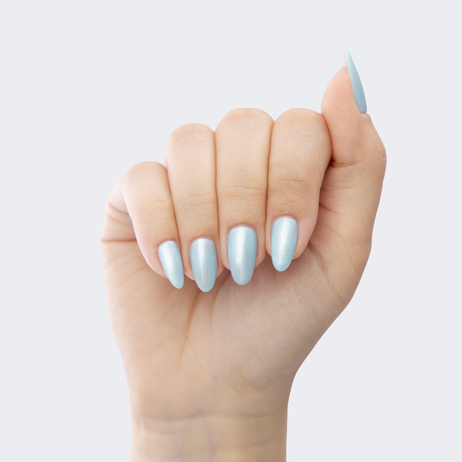 Baby blue. Pastel. Pearl finish. Opaque. Cool undertone.
