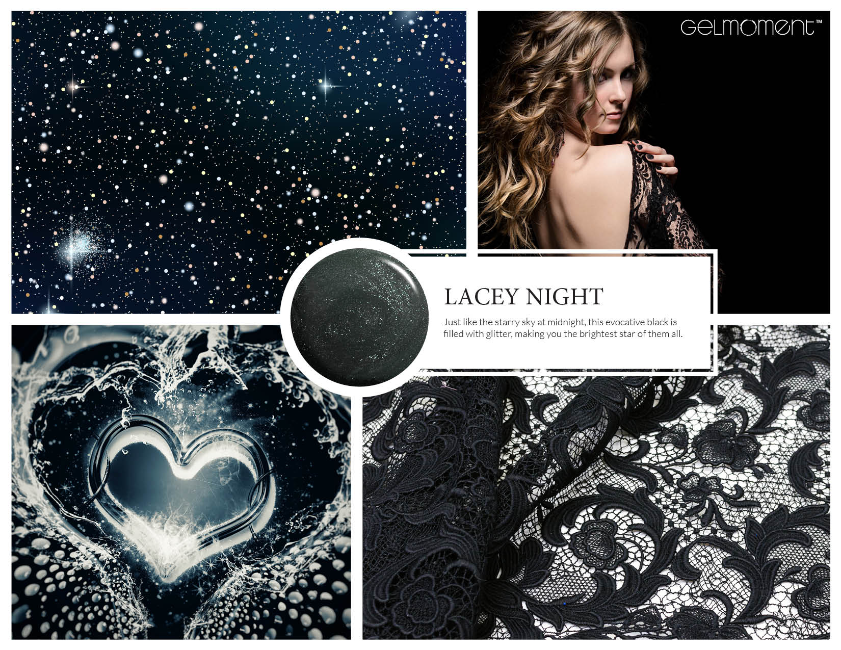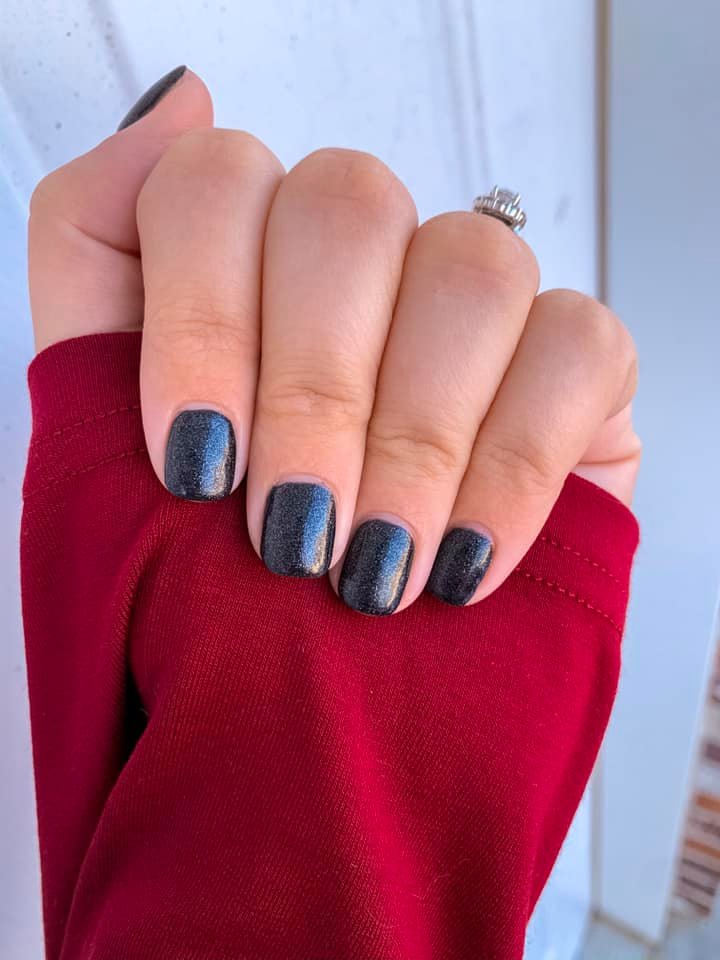 This black polish shimmers with stars aplenty.