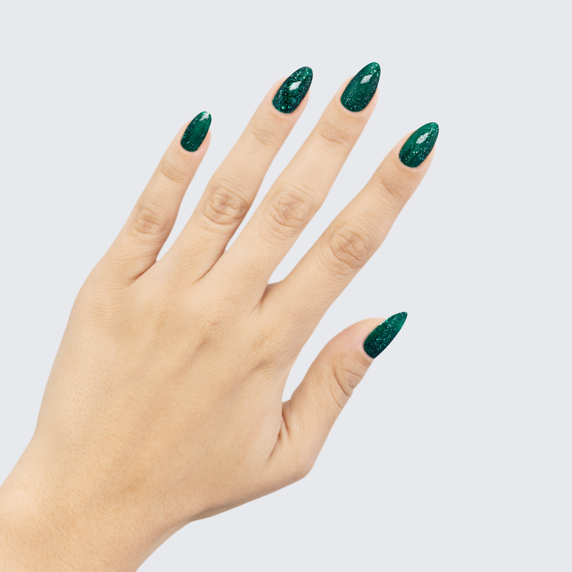 Glitter glistens in the perfect pitch of this deep emerald polish.